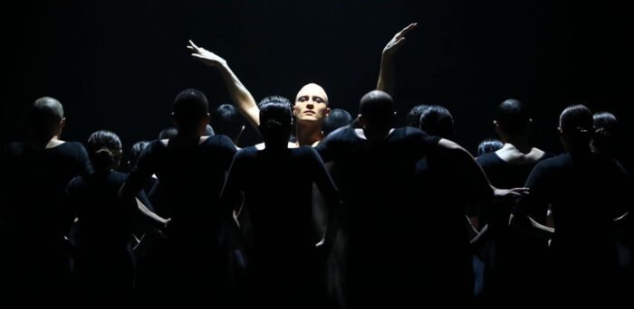 L’énergique déambulation géométrique lie les danseurs costumés de sombre, les renvoie l’un à l’autre avec ces pauses de gestes saccadés, secs et tendus, animal par moments, ceux de grands échassiers juchés sur leurs pointes.