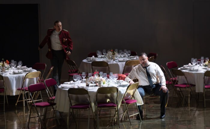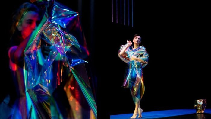 Un maître de cérémonie, plus habillé, excentrique, sur talons hauts, hante le plateau de son indifférence détachée en contrepoint de la musique électronique pleine et rythmée, généreuses de basses de Julien Lepreux.