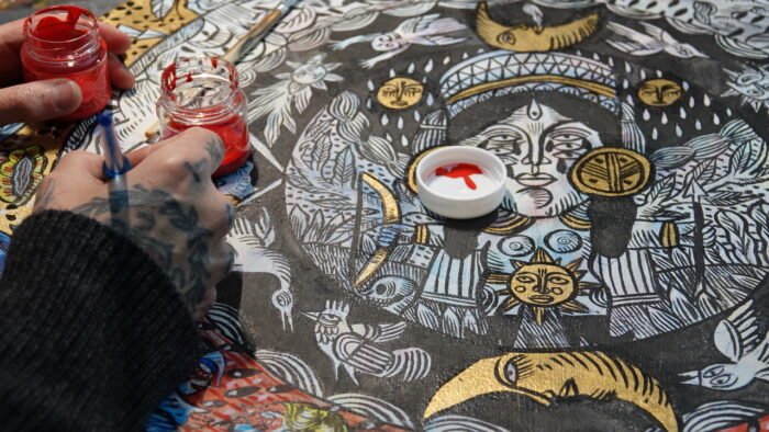M. : J’emmène un tambour que je suis en train de faire, deux Solae[1] – issues d’une série de cinq sur les piliers du protestantisme que j’avais faite pour le Temple Neuf à Metz en résonance avec la spiritualité du lieu de l’exposition Œil Chamane (rentrée 2025).