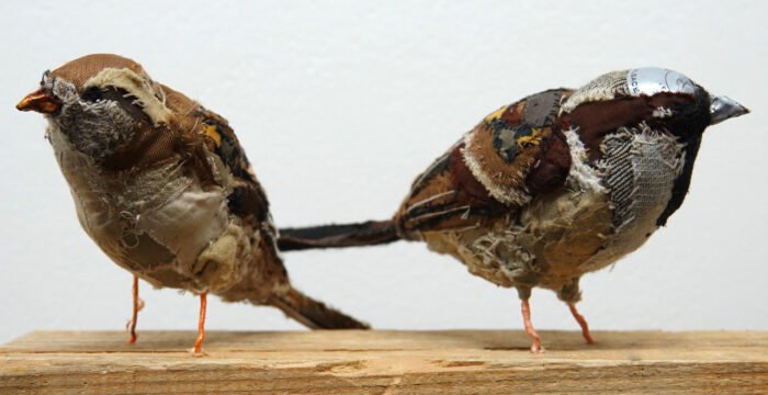 Yoshikazu Goulven Le Maître travaille l’animal à partir de matériaux récupérés, souvent des tissus. Cet été, il a présenté deux grandes sculptures (en métal) à la 2e Biennale d’art contemporain de Bischwiller (Le monde du vivant). À La Filature, il a installé une joyeuse volière de passereaux en chiffons, liège et muselets : Les Petits Oiseaux (2023).